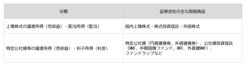 証券会社内での損益通算の対象には主に下記のようなものがあります。