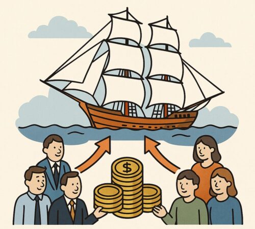 そこで「みんなで少しずつお金を出し合い、大きな船を動かそう。利益が出たら分け合おう」という仕組みが考えられたのです。