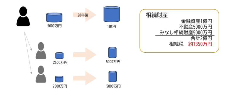 60代のAさんは預金1億円を投資信託などで20年間運用し、大きく資産を増やしました。そして、資産が2億円になった時点で相続が発生したとします。相続財産は不動産も合わせると2億5000万円です。